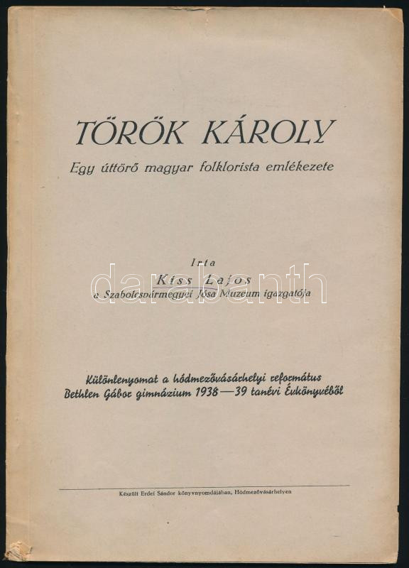 Kiss Lajos: Török Károly. Egy úttörő magyar folklorista emlékezete. DEDIKÁLT Györffi István néprajzkutatónak! Hódmezővásárhely, Erdei Sándor könyvnyomdája. Kiadói papírkötés, kopottas állapotban.