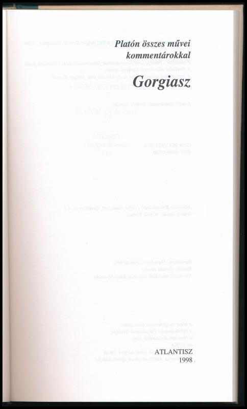 Leírás: Platón: Gorgiasz (Platón összes művei kommentárokkal). Bp., 1998., Atlantisz Könyvkiadó. Kiadói kartonált papírkötés