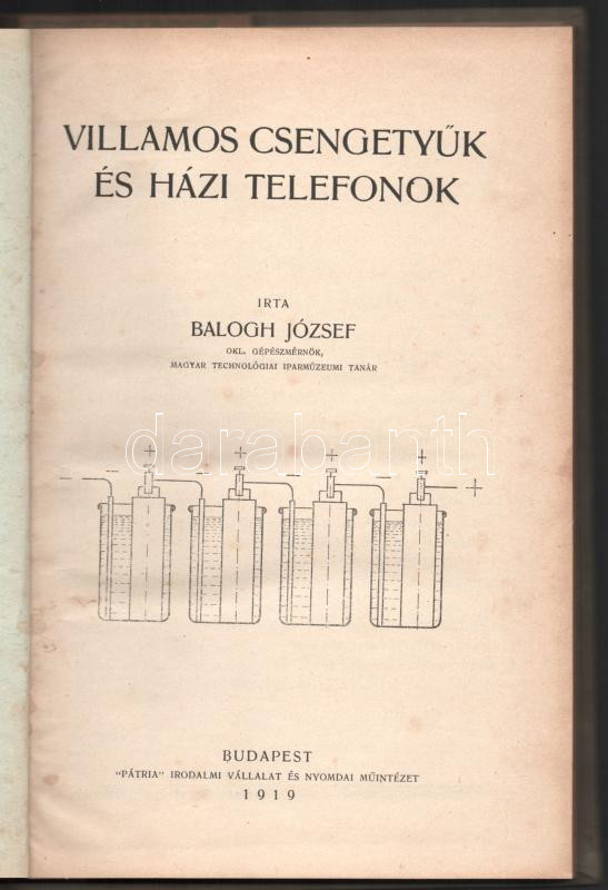 Balogh József: Villamos csengettyűk és házi telefonok. Bp., 1919, Pátr... https://www.darabanth.com/hu/514-Filatelia-kepeslap-numizmatika-mutargy-konyv-papirregiseg-ekszer-aukcio/515.0/Konyvek/Konyvek-Technika~625/Balogh-Jozsef-Villamos-csengettyuk-es-hazi-telefonok-Bp-1919-Patria-Kiadoi-egeszvaszon~II3460449