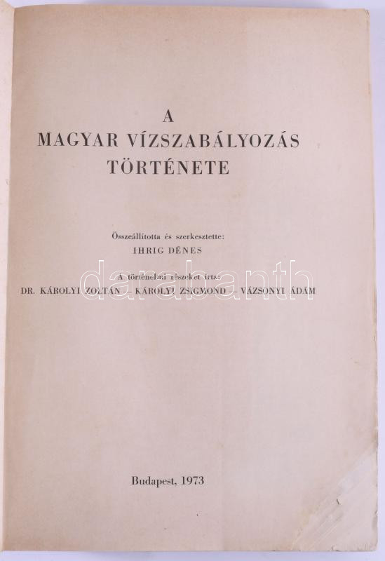 Igrig Dénes: A magyar vízszabályozás története. Összeáll. és szerk.: Ihrig Dénes. Bp., 1973., Országos Vízügyi Hivatal, 398 p. Térképekkel, fotókkal és képekkel illusztrált. Kiadói papírkötés, sérült borítóval és lapokkal, a sarkukon szöveget nem érintő hiánnyal.
