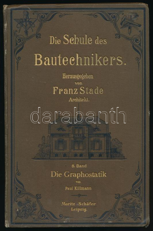 Killmann, Paul: Die Graphostatik. Die Schule des Bautechnikers VIII. Band. Leipzig, 1902, Moritz Schäfer, VIII+96 p.+ 2 (duplaoldalas) t. Német nyelven. Kiadói aranyozott egészvászon-kötés, kissé viseltes borítóval és gerinccel.
