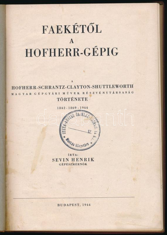 Sevin Henrik: Faekétől a Hofherr-gépig. A Hofherr-Schrantz-Clayton-Shuttleworth Magyar Gépgyári Művek Részvénytársaság története. 1842 -1869 -1944. Bp., 1944, Szerzői, (Révai-ny.), 1 t.+ 272 p. Egyetlen kiadás. Számos fekete-fehér illusztrációval. Átkötött egészvászon-kötés, "Steyr-Austro-Daimler-Puch Művek Rt. Munkás Könyvtára" bélyegzéssel.