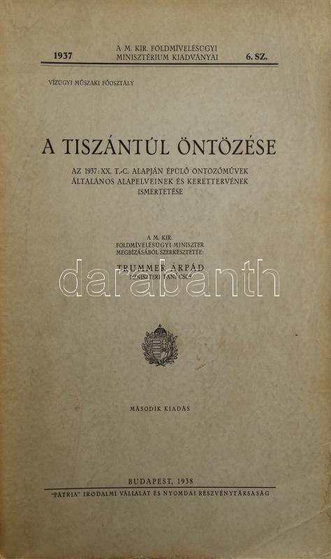 Trummer Árpád (szerk.): A Tiszántúl öntözése. Az 1937:XX. t.c. alapján épülő öntözőművek általános alapelveinek és kerettervének ismertetése. A M. Kir. Földmívelésügyi Minisztérium kiadványai 1937. 6. sz. Bp., 1938, "Pátria"-ny., XII, 280 p.+ 19 (részben duplaoldalas, ill. kihajtható) t. Második kiadás. Kiadói papírkötés, kissé sérült borítóval és gerinccel, belül a lapok jó állapotban.