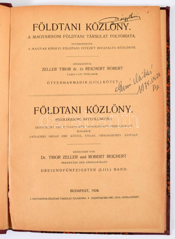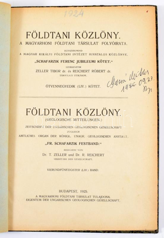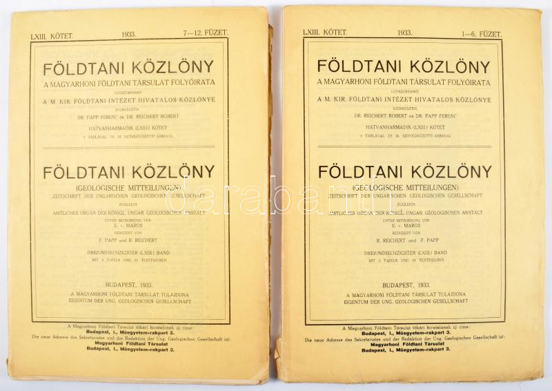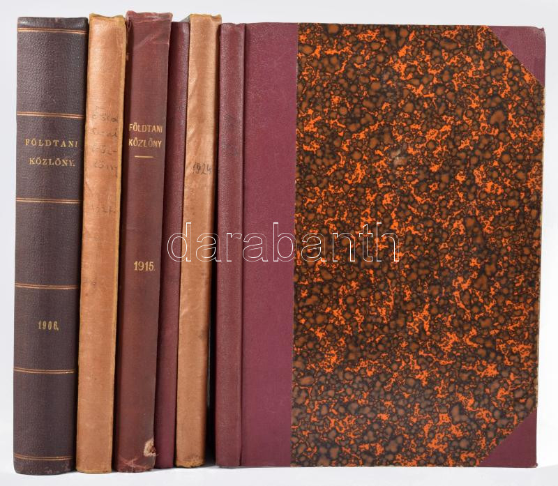 XXXVI. évf. 1-12. sz. Szerk.: Pálffy Mór, XXXXV. Évf. 1-12. sz. Szerk.: Papp Károly, L. évf. Szerk.: László Gábor, Vogl Viktor., LIII. évf., LIV. évf., LVII. évf. Szerk.: Zeller Tibor,és Reichert Robert., LXIII. évf. 1-12. sz. Szerk.: Reichert Róbert és Papp Ferenc. Bp., 1915-1933, Magyarhoni Földtani Társulat, XXIII+1+162+2 p.+ IX (a táblák előtt magyarázó lapokkal) t.+[125]-158+2 p.+1 t.+165-479 p.+1 (magyarázó lappal a tábla előtt) t.; XI+1+334 p.+ III (magyarázó lapokkal) t.; 4+144 p.+ III t.; 168 p.; 256 p.; VI+2+264 p.+IX t. + 2 t. ; 1 t.+116 p.+4 t., IV+117-227 p.+4 t.