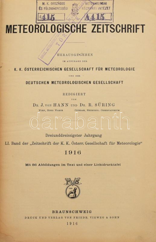 1916 Meteorologische Zeitschrift. Herausgegeben im Auftrage der k. k. Österreichischen Gesellschaft für Meteorologie und der Deutschen Meteorologischen Gesellschaft. Redigiert von Dr. J. von Hann und Dr. R. Süring. XXXIII. Jahrgang. Braunschweig, 1916, Friedr. Vieweg & Sohn, XIII+(3)+560 p. Német nyelven. Félvászon-kötésben, kissé sérült borítóval, a hátsó kötéstáblán sarokhiánnyal, belül nagyrészt jó állapotban, régi intézményi bélyegzőkkel.