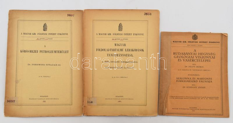 3 db különlenyomat a Magyar Kir. Földtani Intézet évkönyvéből: Telegdi-Roth Lajos: Magyar földolaj-tartalmú lerakódások tanulmányozása. I. Zsibó környéke Szilágymegyében.; Posewitz Tivadar: A kőrösmezei petroleumterület.; Pálfy Móric: A rudabányai hegység geológiai viszonyai és vasérctelepei. Függelékül: Sümeghy József: Szalonna és Martonyi forrásmészkő faunája. Bp., 1895-1924, Franklin-ny. / Magyar Tudományos Társulatok Sajtóvállalata-ny. Kiadói papírkötés, változó állapotban, sérülésekkel, tulajdonosi bejegyzésekkel, intézményi bélyegzőkkel.