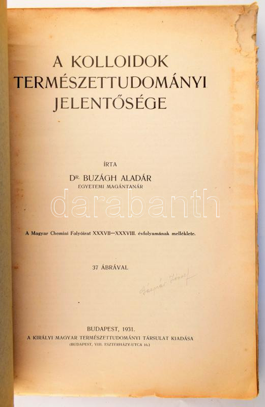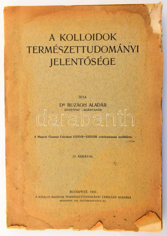 Buzágh Aladár: A kolloidok természettudományi jelentősége. Bp., 1931, Kir. M. Természettudományi Társulat, VIII+212 p. Kiadói papírkötés, sérült, foltos borítóval, az első 2 lap felső részén kis hiánnyal, sérüléssel.