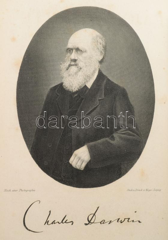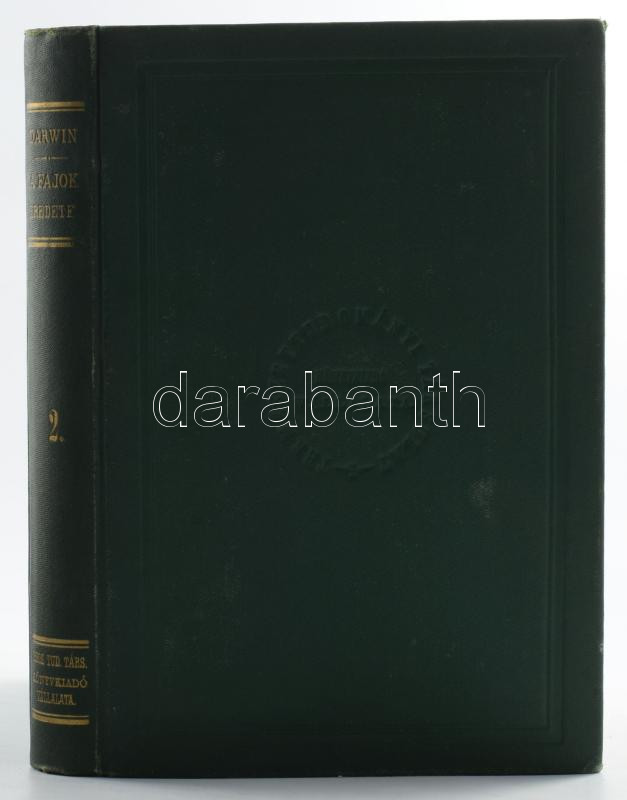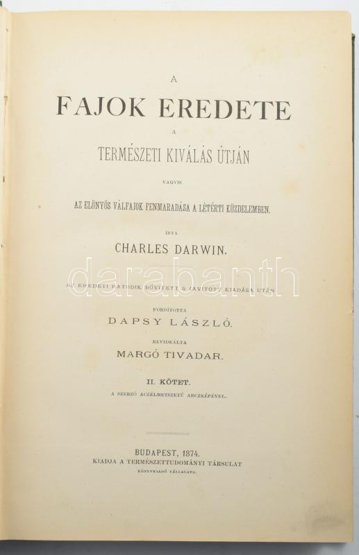 Darwin, Charles: A fajok eredete a természeti kiválás útján vagyis az előnyös válfajok fenmaradása a létérti küzdelemben. Az eredeti hatodik bővitett s javitott kiadása után fordította Dapsy László. Revideálta Margó Tivadar. II. kötet. Bp., 1874., Kir. Magyar Természettudományi Társulat, 1 t.+VII+361+3 p. Első magyar kiadás. Kiadói aranyozott egészvászon-kötés, kissé kopott borítóval.