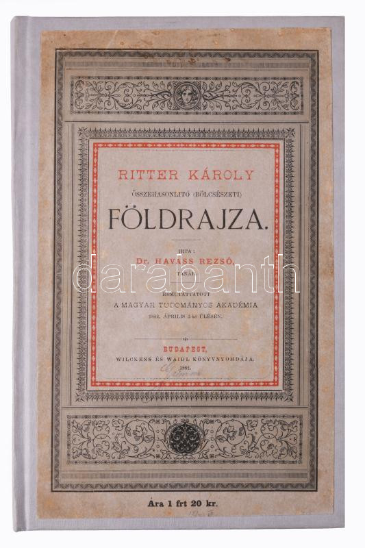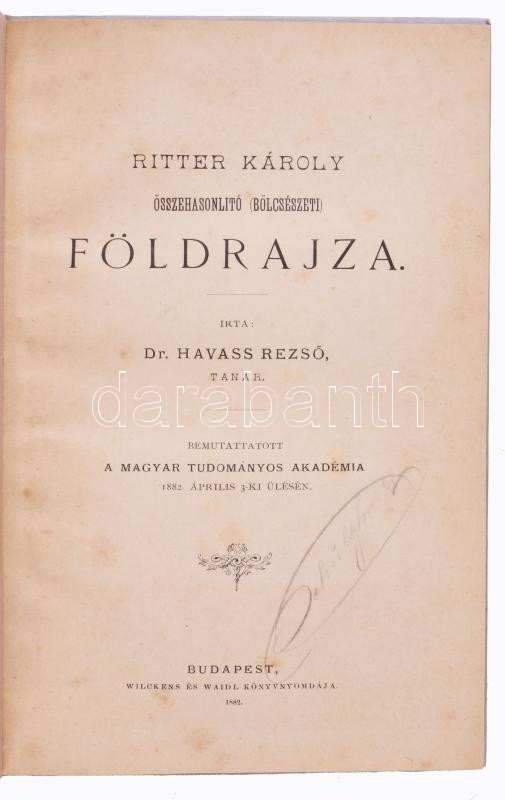 Dr. Havass Rezső: Ritter Károly Összehasonlító (Bölcsészeti) Földrajza. Bemutttatott a Magyar Tudományos Akadémia 1882. április 3-ki ülésén. Bp., 1882, Wilckens és Waidl Könyvnyomdája. Átkötött egészvászon-kötésben, tulajdonosi névbejegyzéssel, jó állapotban.