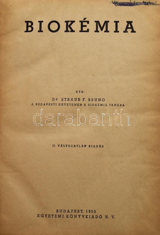 Erdey László: Bevezetés a kémiai analízisbe. I. köt.: Minőség kémiai analízis. Bp., 1945, Magyar Természettudományi Társulat, 323+(1) p. Félvászon-kötésben, hiányos gerinccel, tulajdonosi névbejegyzéssel. + Straub F. Brunó: Biokémia. Bp., 1950, Egyetemi Könyvkiadó N. V., 219+(1) p. Második kiadás. Félvászon-kötésben, helyenként kisebb ázásnyomokkal, kissé hullámos lapokkal.