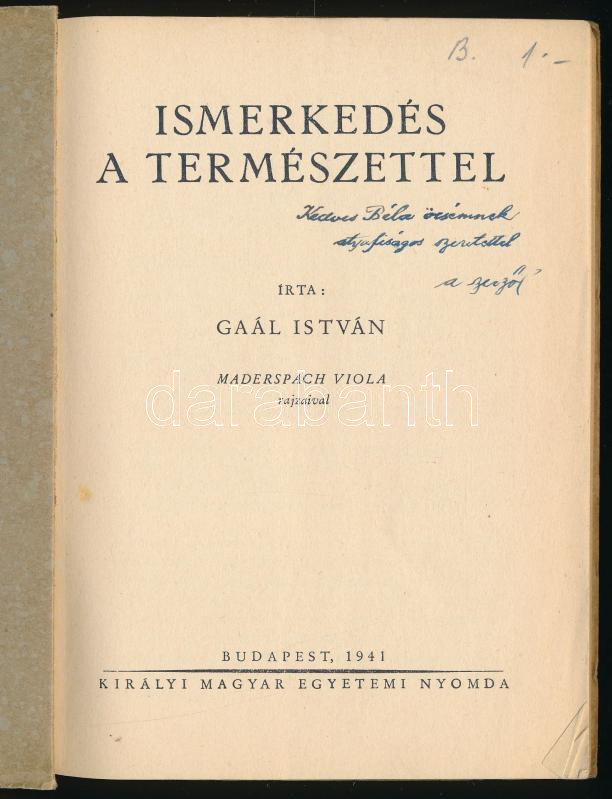 Gaál István: Ismerkedés a természettel. DEDIKÁLT! Maderspach Viola rajzaival. Bp., 1941, Királyi Magyar Egyetemi Nyomda. Kiadói papírkötés, jó állapotban.