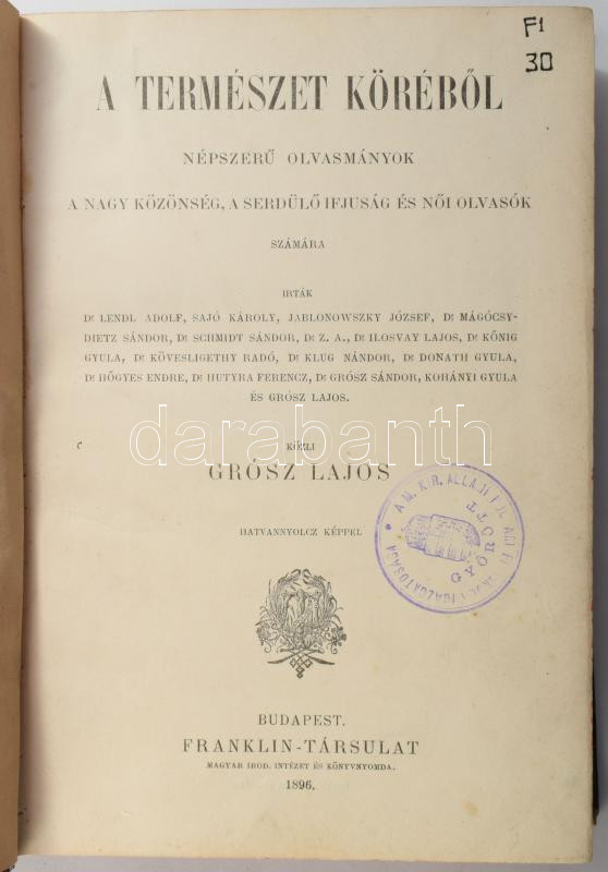 Grósz Lajos: A természet köréből. Népszerű olvasmányok a nagyközönség, a serdülő ifjuság és női olvasók számára. Bp., 1896, Franklin-Társulat, [8]+350+[2] p. Szövegközti és egészoldalas fekete-fehér illusztrációkkal. Átkötött félvászon-kötésben, sérült gerinccel, régi intézményi bélyegzőkkel.