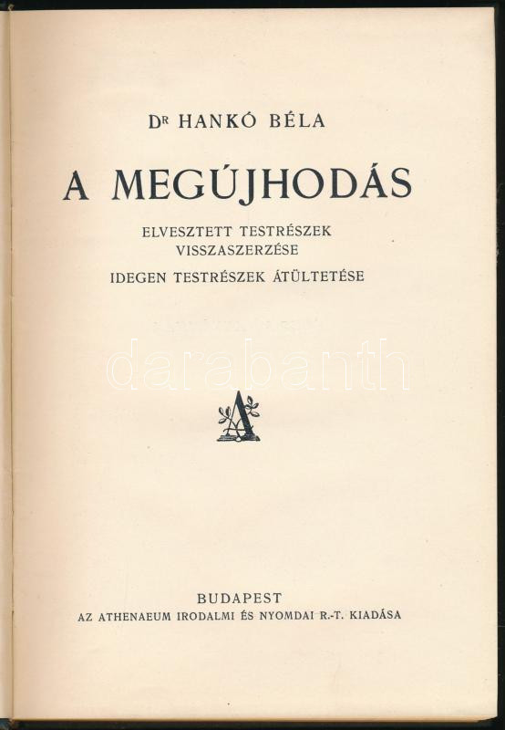 Hankó Béla: A megújhodás. Elvesztett testrészek visszaszerzése. Idegen testrészek átültetése. Bp., [1927], Athenaeum, 186+[2] p.+ 1 t. Egyetlen kiadás. Kiadói egészvászon-kötés, kissé foltos borítóval, belül jó állapotban, ex libris-szel.