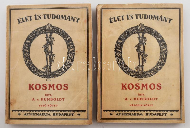 Humboldt, [Alexander von]: Kosmos. I-II. köt. Ford.: Fülöp Zsigmond. W. Bölsche előszavával. Élet és Tudomány. Bp., [1925], Athenaeum, 215 p.; 178 p. A borító Gara Arnold munkája. Kiadói papírkötés, kissé sérült, foltos borítóval és gerinccel, néhány kissé foltos lappal, átlátszó műanyag védőborítóban.