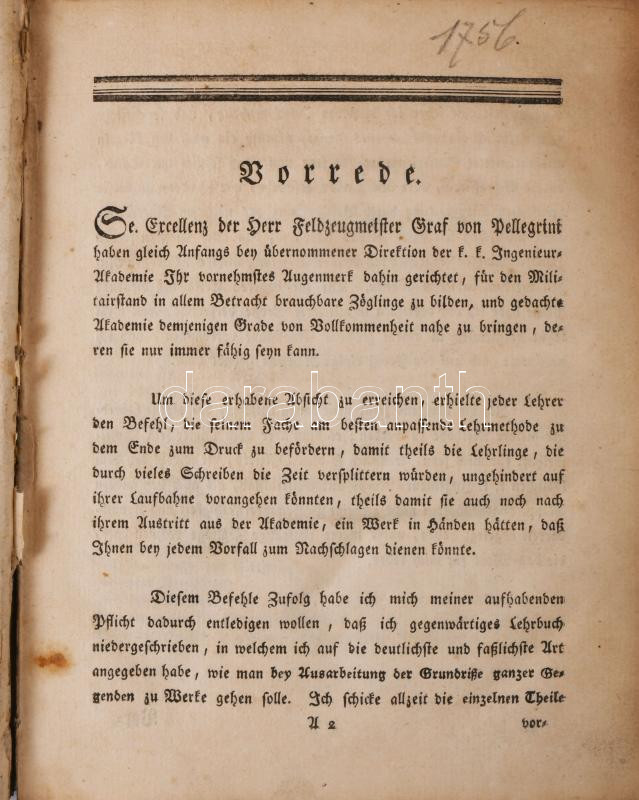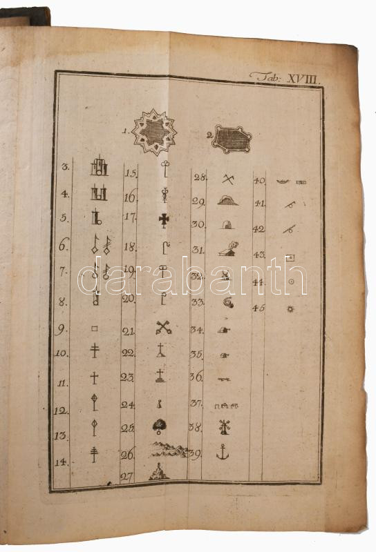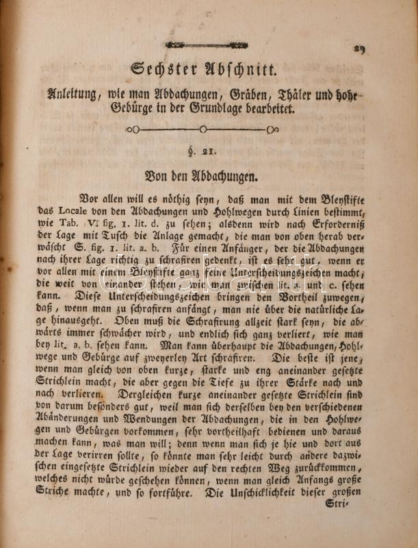 [Landerer, Ferdinand (1743-1796): Gründliche Anleitung Situations-Plane zu zeichnen, zum Gebrauche der k.k. Ingenieur-Akademie, wie auch jener, die sich den Mappirungs-Geschäften widmen. Hrsg. von - - Leherer in der K. K. Ingenieur-Akademie. Mit 18 gestochenen Planen. Wien, 1796. Johann Georg Mößle,] [III]-X+75+1 p.+XVIII (18 rézmetszetű, kihajtható tábla, amiből 1 kézzel színezett) t. Német nyelven.