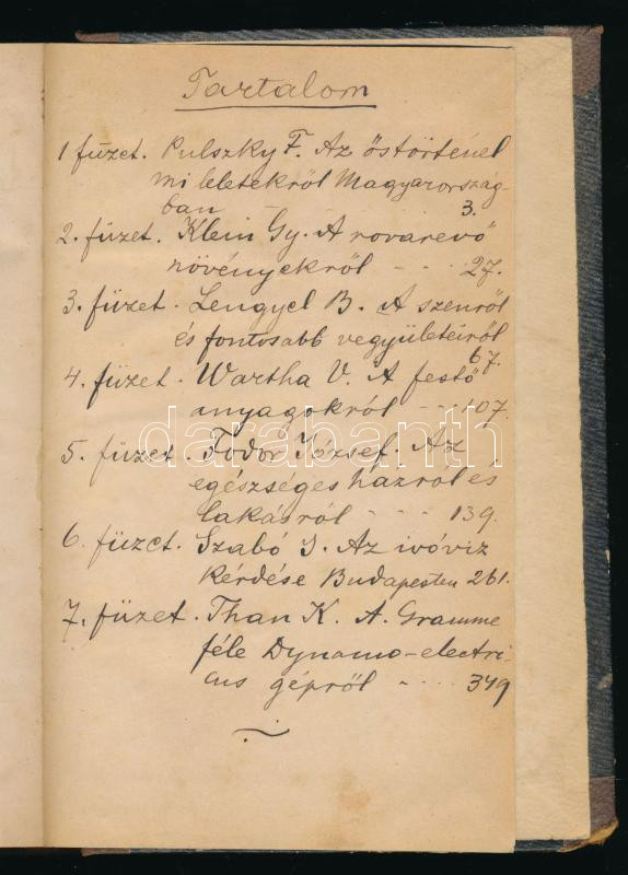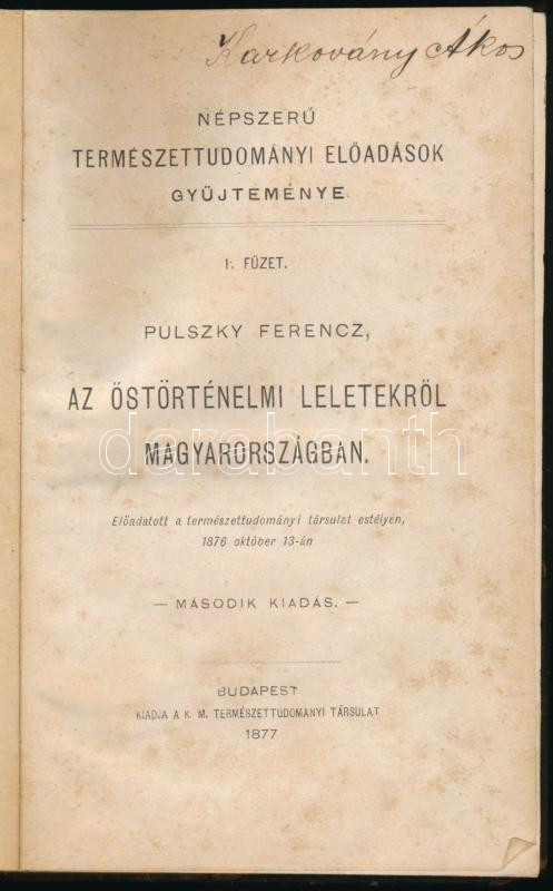 Népszerű Természettudományi Előadások Gyűjteménye 1-7. füzetek (egybekötve): Pulszky Ferenc: Az őstörténelmi leletekről Magyarországban.; Klein Gyula: A rovarevő növényekről.; Lengyel Béla: A szénről és fontosabb vegyületeiről.; stb. Bp., 1877, K. M. Természettudományi Társulat. Félvászon-kötésben, kissé viseltes borítóval, helyenként foltos lapokkal, az első címlapon Karkovány Ákos névbejegyzésével, a kötet végén kézzel írt tartalomjegyzékkel.