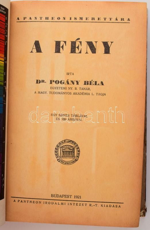 Pogány Béla: A fény. Pantheon Ismerettára. Bp., 1921., Pantheon, 1 t + 366+2 p. Gazdag fekete-fehér képanyaggal illusztrált. Kiadói kartonált papírkötés, kopott, foltos borítóval, sérült, hiányzó gerinccel, de belül jó állapotban.
