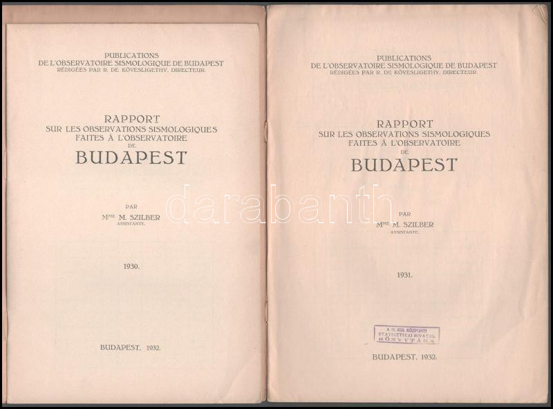 Szilber M.: Rapport sur les observations sismologiques faites a l'Observatoire de Budapest. 1930-1931. (2 füzet). Publications de l'Observatoire sismologique de Budapest. Bp., 1932, Földrengési Obszervatórium, 17 p.; 16 p. Francia nyelven. Kiadói tűzött papírkötés, intézményi bélyegzőkkel, az egyik füzet foltos borítóval, a másik felvágatlan lapokkal.