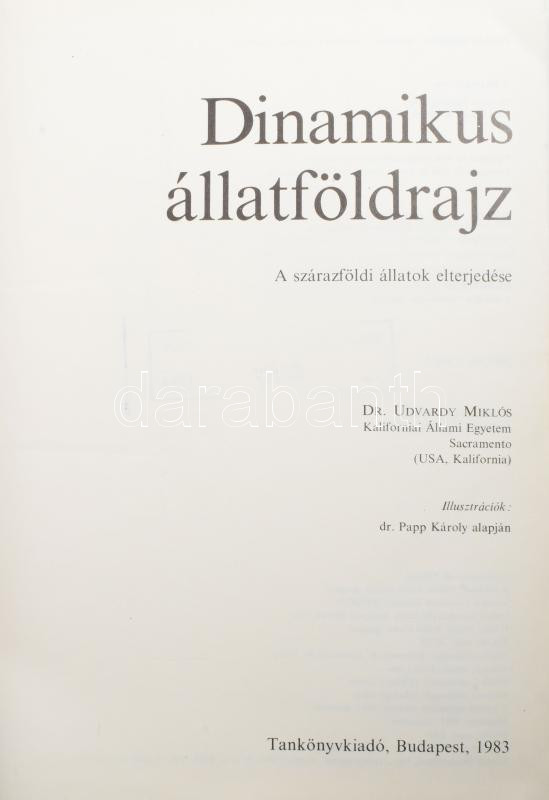 Udvardy Miklós: Dinamikus állatföldrajz. A szárazföldi állatok elterjedése. Bp., 1983, Tankönyvkiadó, 496 p.+ 3 (kihajtható) t. Kiadói kartonált papÃrkötés, sérült gerinccel, intézményi bélyegzÅ‘kkel.