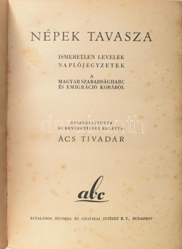 Ács Tivadar (szerk.): Népek Tavasza. Ismeretlen Kossuth levelek. Kiadatlan naplók a szabadságharc korából. Bp., é.n., ABC. Kiadói papírkötésben Szép állapotban