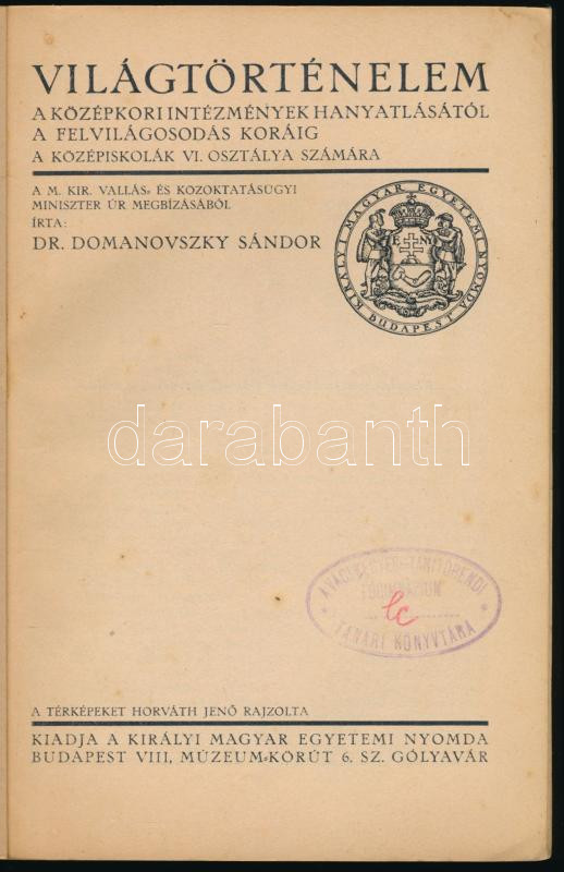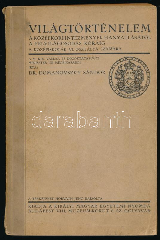 Domanovszky Sándor: Világtörténelem. A középkori intézmények hanyatlásától a felvilágosodás koráig. A középiskolák VI. osztálya számára. Bp., [1929], Kir. M. Egyetemi Nyomda, 200 p.+ 10 t. Kiadói papírkötés, kissé foltos borítóval, sérült gerinccel