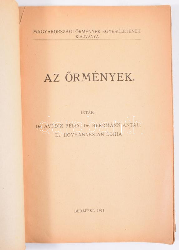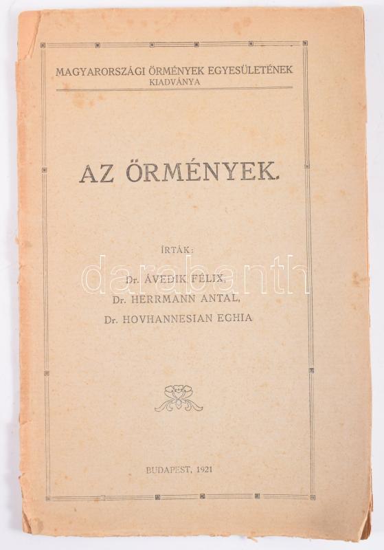 Dr. Ávedik Félix - Hermann Antal - Hovhannesian Eghia: Az örmények. Bp., 1921. Magyarországi Örmények Egyesületének Kiadványa.38 + 2 p. Kiadói papírkötés, hátsó borító nélkül
