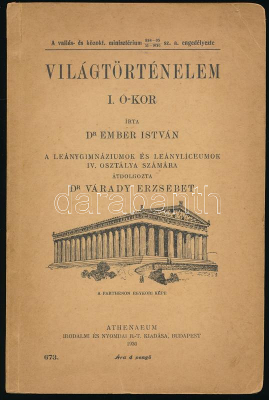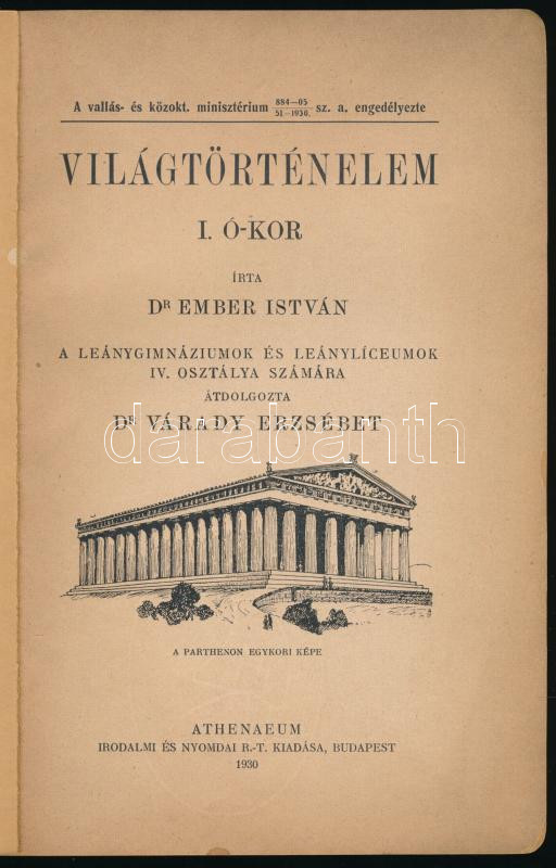 Ember István: Világtörténelem. I. Ó-kor. A leánygimnáziumok és leánylíceumok IV. osztálya számára átdolgozta: Várady Erzsébet. Bp., 1930, Athenaeum, 133+[1] p.+ 1 (kihajtható) t. Kiadói papírkötés, sérült borítóval