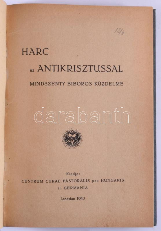 Harc az Antikrisztussal. Mindszenty bíboros küzdelme. Landshut, 1949, ... https://www.darabanth.com/hu/514-Filatelia-kepeslap-numizmatika-mutargy-konyv-papirregiseg-ekszer-aukcio/515.0/Konyvek/Konyvek-Tortenelem~617/Harc-az-Antikrisztussal-Mindszenty-biboros-kuzdelme-Landshut-1949-Centrum-Curae-Pastoralis-FC3~II3482019