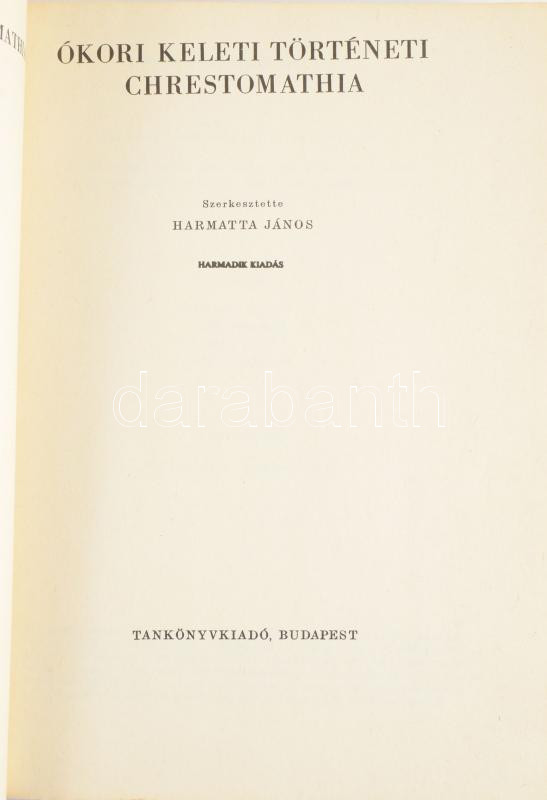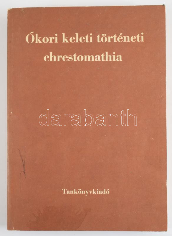 Harmatta János (szerk.): Ókori keleti történeti chrestomathia. Bp., 1989, Tankönyvkiadó. Harmadik kiadás. Kiadói papírkötés, a borítón folttal, kissé foltos lapélekkel. Megjelent 2000 példányban.