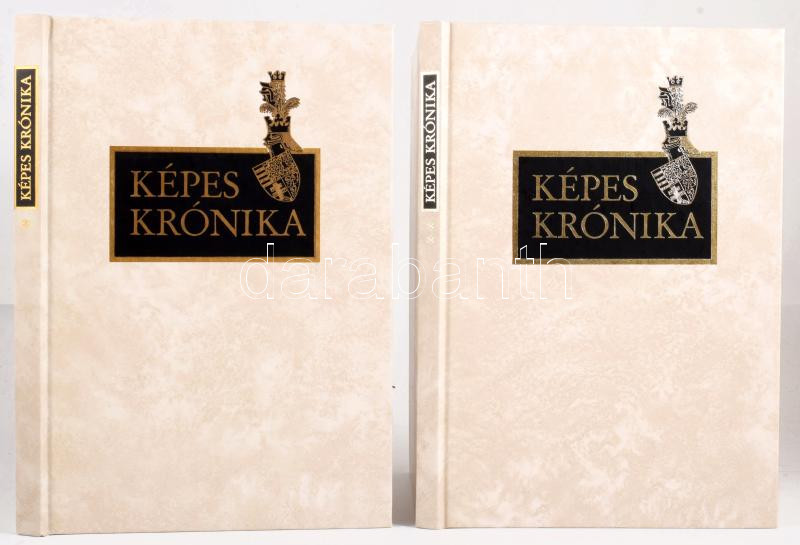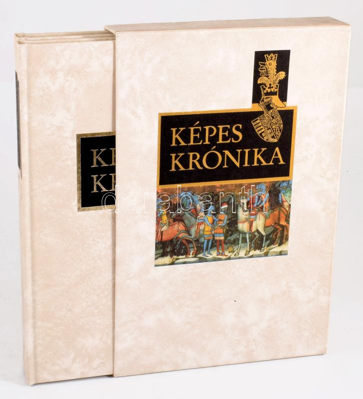 A Krónika-kötet minden oldala színes, számos oldalán aranyozással. A tanulmánykötet tartalma: Képes Krónika (Fordította Bellus Ibolya) - Jegyzetek (Összeállította: Kristó Gyula) - Dercsényi Dezső: A Képes Krónika és kora - Kristó Gyula: A Képes Krónika szerzője és szövege - Csapodiné Gárdonyi Klára: A Képes Krónika kódexének leírása, története és illusztrációi. Számozatlan példány! Kiadói aranyozott, illusztrált egészműbőr-kötésben, kiadói kartontokban, jó állapotban.