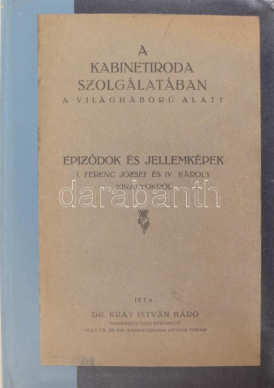 Kray István báró: A kabinetiroda szolgálatában a világháború alatt. Epizódok és jellemképek. I. Ferenc József és IV. Károly királyokról. Zalaegerszeg 1935, Zrínyi, 157 p. Átkötött félvászon-kötés, körbevágott.