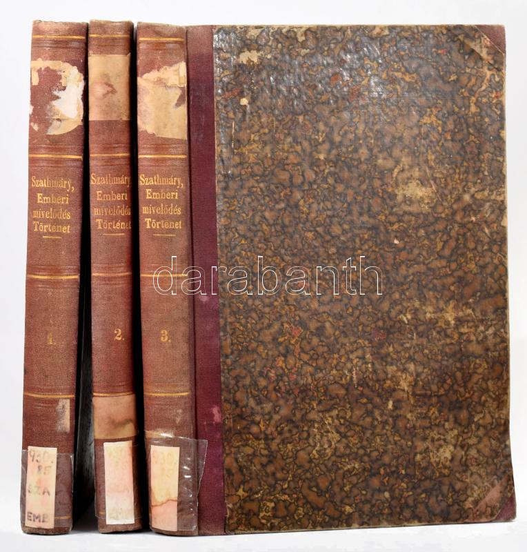 Leírás: P. Szathmáry Károly: Az emberi mívelődés története I-III. Bp., 1881, Tettey Nándor és Társa. Félvászon kötés, kopottas állapotban.
