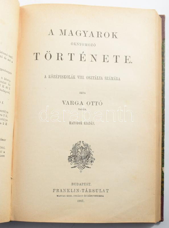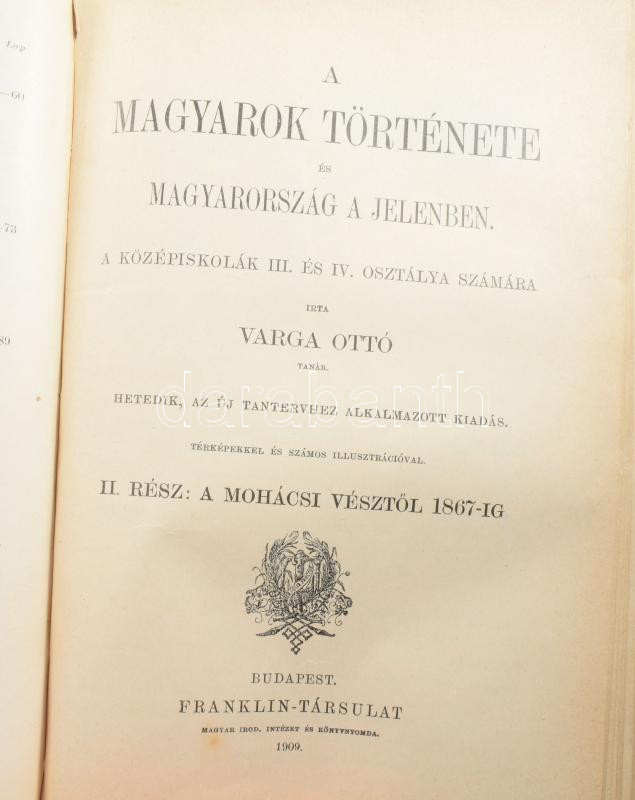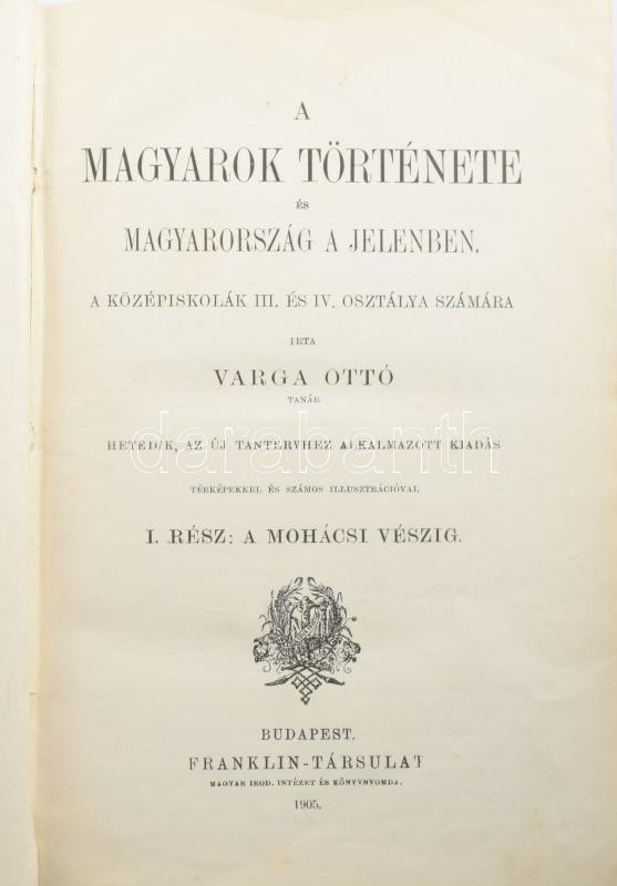 Varga Ottó: A magyarok története és Magyarország a jelenben. I-II. rész. I.: A mohácsi vészig. II.: A mohácsi vésztől 1867-ig. Hozzákötve: A magyarok oknyomozó története. Bp., 1905-1909, Franklin-Társulat, VI+[2]+152 p.+ 4 (színes térképek) t.; 144 p.+ 3 t.; 296 p. Félvászon-kötésben, kissé viseltes borítóval.