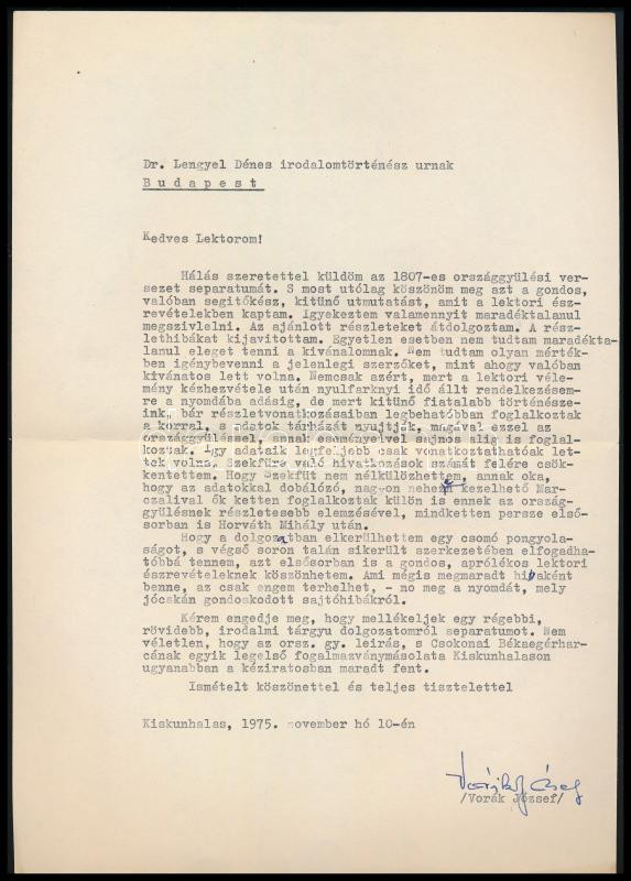 Leírás: Vorák József: 1807-es országgyűlés verses leírása. DEDIKÁLT Lengyel Dénesnek! Kecskemét, 1975, Bács-Kiskun megyei Múzeumok Közleményei. Kiadói papírkötés, kopottas állapotban + egy gépelt levél Vorák József aláírásával