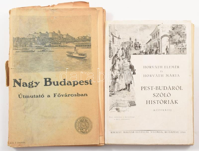 2 db könyv - Horváth Elemér-Horváth Mária: Pest-Budáról szóló históriák (képekkel). Bp., 1944, Kir. M. Egyetemi Nyomda. + Horváth E. János: Nagy Budapest. Útmutató a székesfővárosban. Bp., 1910, Szent István Társulat. Kiadói papírkötés, viseltes állapotban.
