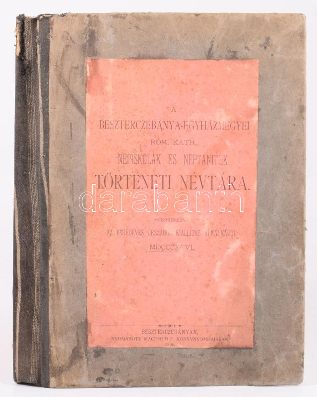A Beszterczebánya-Egyházmegyei Róm. Kath. Népiskola És Néptanítók Történeti Névtára. Szerkesztve Az Ezredéves Országos Kiállítás Alkalmából. MDCCCXCVI. Besztercebánya, 1896. Machold. F. XIX. 276 + (2)p. Korabeli félvászon kötésben, az eredeti papírborító felhasználásával, a borító megviselt, a lapok épek. Ritka!