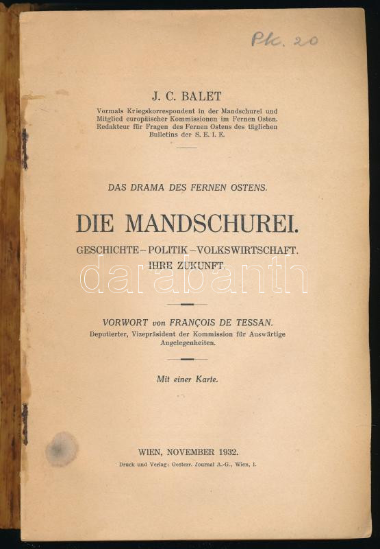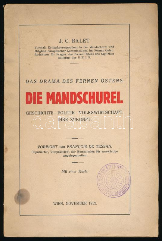 Balet, J. C.: Die Mandschurei. Das Drama des fernen Ostens. Geschichte - Politik - Volkswirtschaft. Ihre Zukunft. Wien, 1932, Oesterr. Journal A.-G., 207+(1) p. Német nyelven. Kiadói papírkötés, kissé foltos, a könyvtesttől elvált borítóval, "Japán császári konzulátus Budapest" bélyegzéssel.
