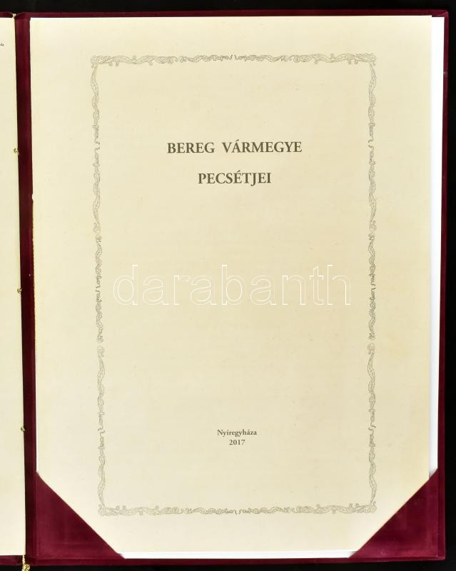 Bereg vármegye címeres pecsétje 1836. Szerk.: Kujbusné Mecsei Éva, Mykhailo Mishuk. A Magyar Nemzeti Levéltár Szabolcs-Szatmár-Bereg Megyei Levéltár kiadványai II. közlemények 47. Nyíregyháza, 2017., Magyar Nemzeti Levéltár Szabolcs-Szatmár-Bereg Megyei Levéltára, 8 p. +4 sztl. lev. + 42 p. Hasonmás kiadás. Magyar, ukrán, angol nyelven. A hasonmás rész latin nyelven. Kiadói aranyozott bársony-kötésben, szép állapotban, 37x28 cm Megjelent 750 példányban.