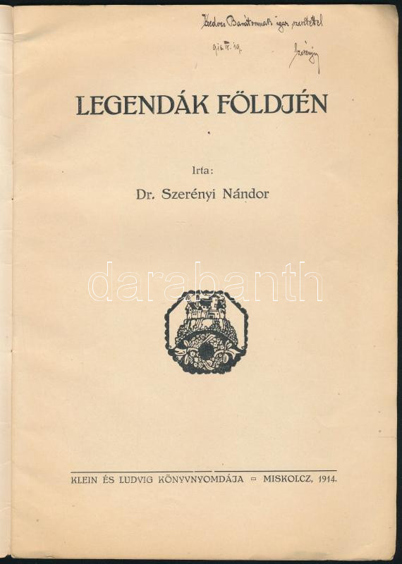 Dr. Szerényi Nándor: Legendák földjén. DEDIKÁLT! Miskolc, 1914, Klein ... https://www.darabanth.com/hu/514-Filatelia-kepeslap-numizmatika-mutargy-konyv-papirregiseg-ekszer-aukcio/515.0/Konyvek/Konyvek-Utazas-helytortenet~614/Dr-Szerenyi-Nandor-Legendak-foldjen-DEDIKALT-Miskolc-1914-Klein-es-Ludvig-Konyvnyomda~II3477228