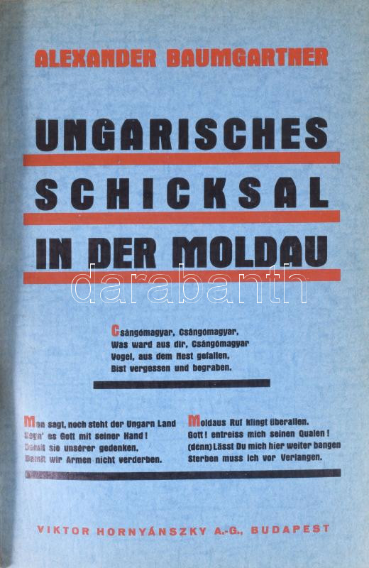 Baumgartner Sándor: Moldva, a magyarság nagy temetője. Bp., (1940.), Hornyánszky Viktor, 32 p. Bekötött eredeti papírborítóval.; Hozzákötve: