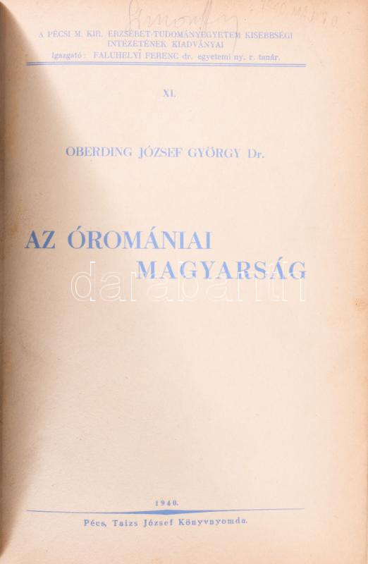 Óberding József: Az óromániai magyarság, Pécs, 1940., Taizs József, 67p. Bekötött eredeti papírborítóval.; Hozzákötve: