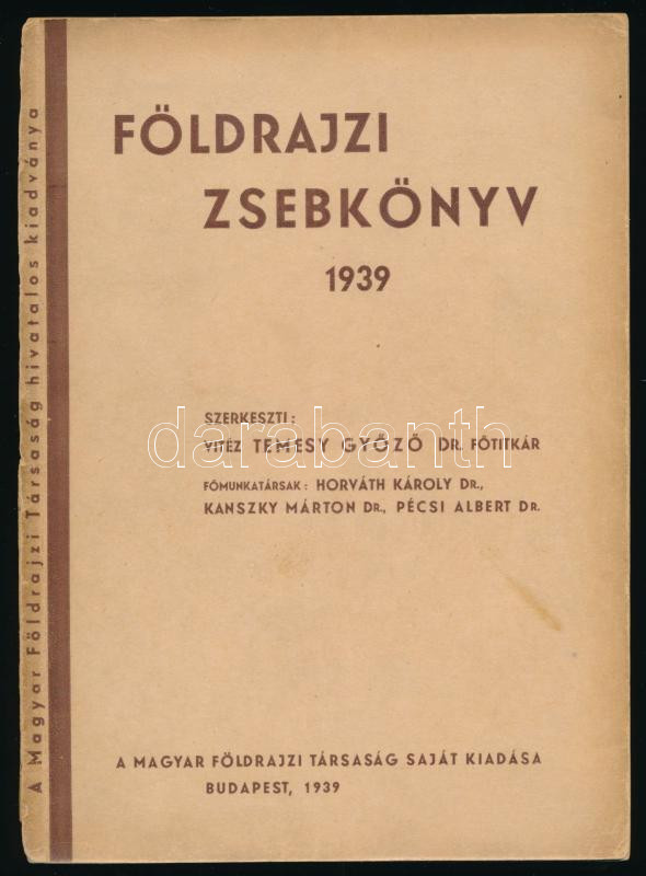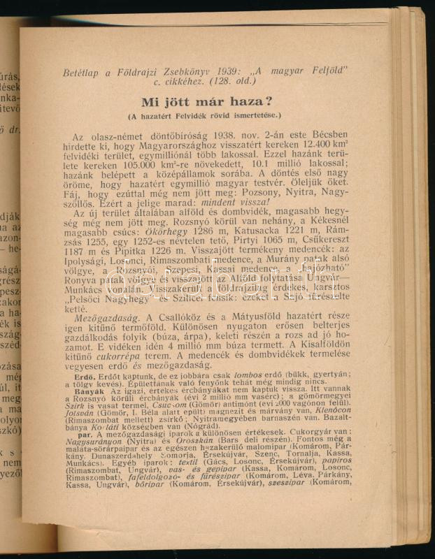 Földrajzi zsebkönyv. Szerk.: Temesy Győző. Cholnoky Jenő előszavával. Bp., 1939, Magyar Földrajzi Társaság, 192 p. + 2 t. Benne utólagosan berakott betétlappal: "Betétlap a Földrajzi Zsebkönyv 1939: "A magyar Felföld" c. cikkéhez? (128. old.) Mi jött már haza? (A hazatért felvidék rövid ismertetése.", rajta térképpel a visszatért területekről, 2 sztl. lev. Kiadói papírkötés, hiányos gerinccel, szakadt borítóval, a betétlap sarkán hiánnyal.