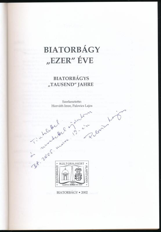 Horváth Imre - Palovics Lajos (szerk.): Biatorbágy ,,ezer" éve. Helytörténeti olvasókönyv I. Az egyik szerkesztő, Palovics Lajos történész, kartográfus, Biatorbágy volt polgármestere által dedikált példány. Biatorbágy, 2002, Biatorbágy Kultúrájáért Alapítvány, 263+[1] p.+ VIII (színes képek) t. Kiadói papírkötés.