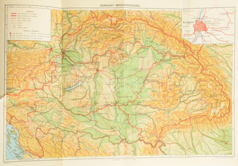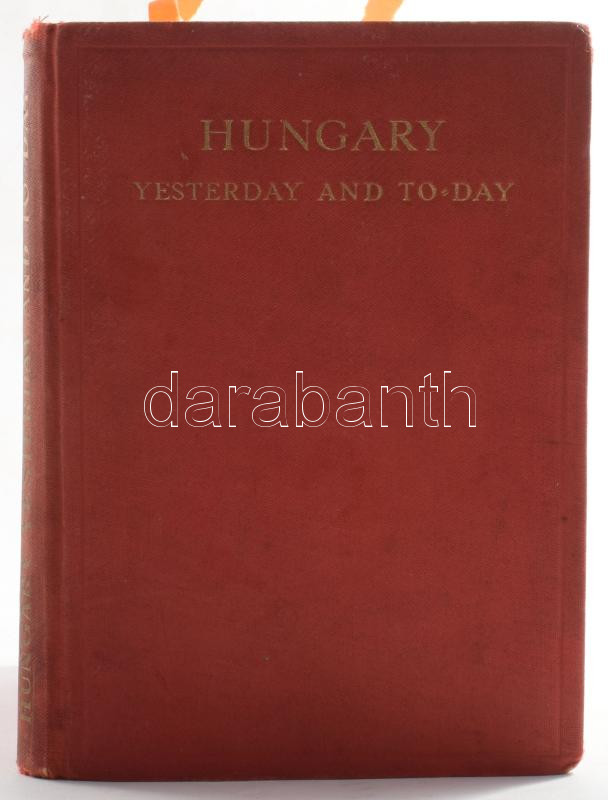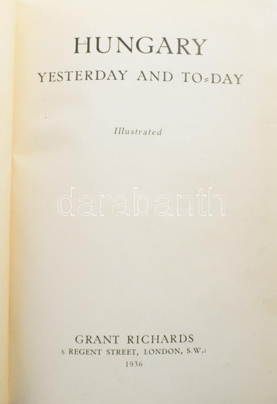 Hungary. Yesterday and to-day. Illustrated. London, 1936, Grant Richards, 237 p.+1 (kihajtható, színes térkép, gyűrődéssel) t. Angol nyelven. Fekete-fehér szövegközti illusztrációkkal. Kiadói aranyozott egészvászon-kötés, kissé kopott borítóval.