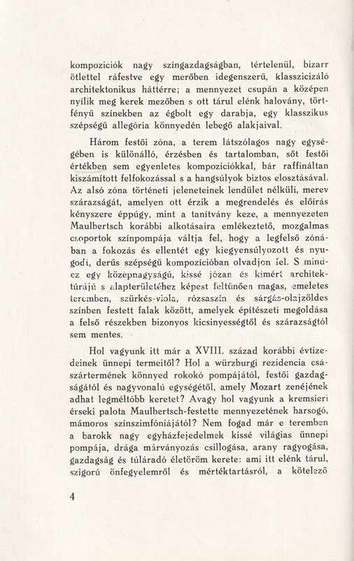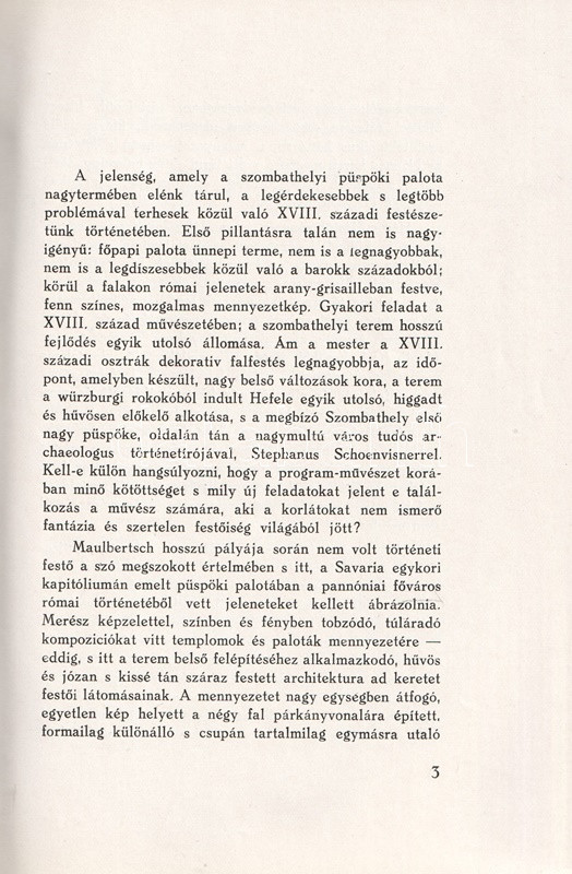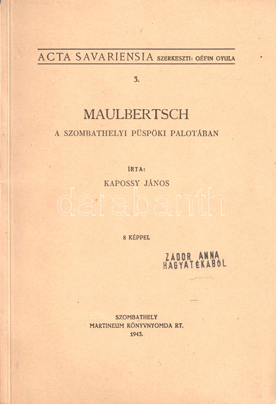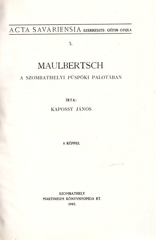 Kapossy János (1894-1952) művészettörténész, egyetemi tanár. Elsősorban a hazai barokk korszakkal foglalkozott. Rövid tanulmánya Franz Anton Maulbertsch (1724-1796), a hazánkban alkotó osztrák festőművész szombathelyi munkásságát elemzi. A frissen alapított szombathelyi római katolikus egyházmegye püspöki palotája 1778-1783 között épült, egyes freskóinak megalkotására a Dunántúlon már számos reprezentatív művet megalkotó művészt kérték fel. A művész korai, szertelen és energikus rokokó festészetét a szombathelyi püspöki palotában komolyabb, klasszicizmusba hajló művészet váltotta fel. A Savaria történetéből vett történeti freskók, illetve a mennyezetfestmény 1783-ban készült el. Az első borítófedélen hagyatéki bélyegzés, "Zádor Anna hagyatékából" felirattal.