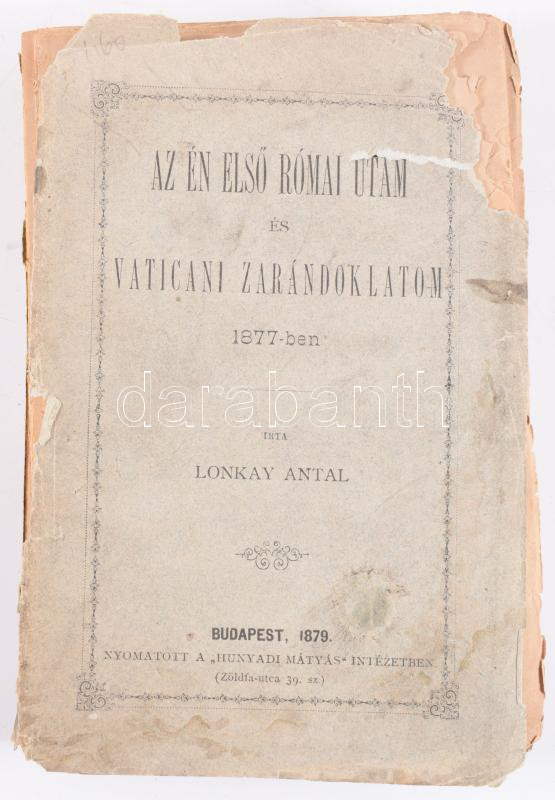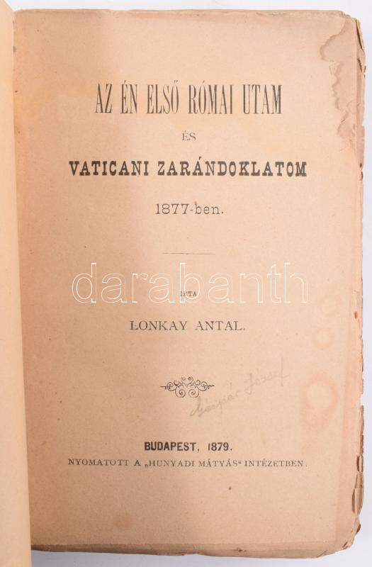 Lonkay Antal: Az én első római utam és vaticani zarándoklatom 1877-ben. Bp., 1879, Hunyadi Mátyás Intézet. Kiadói papírkötés, viseltes, széteső állapotban.