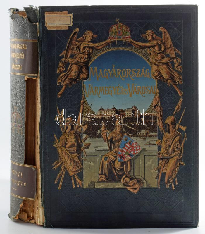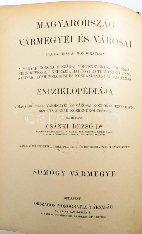 Somogy vármegye. Szerk.: Dr. Csánki Dezső. Magyarország vármegyéi és városai. Magyarország monográfiája. Bp.,(1914),Országos Monográfia Társaság,(Hornyánszky-ny.), 1 t.(térkép)+655 p. Kiadói aranyozott, festett, dombornyomásos egészvászon-kötésben, Gottermayer-kötés, festett lapélekkel, gerinc sérült, egyébként jó állapotban, intézményi bélyegzőkkel.