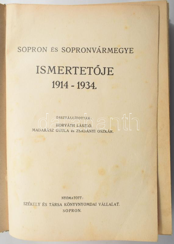 Leírás: Sopron és Sopronvármegye ismertetője 1914-1934. Összeáll.: Horváth László, Madarász Gyula, Zsadányi Oszkár. Sopron, [1936], Székely és Társa, 124 p.+ 246 p.+ 20 (fekete-fehér képek) t. Kiadói aranyozott, dombornyomott címerekkel díszített egészvászon-kötés, kopottas borítóval, kissé sérült gerinccel, helyenként kissé foltos lapokkal.