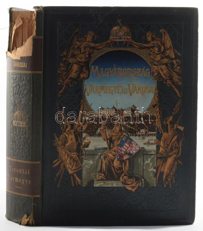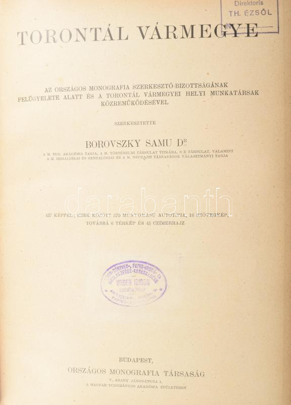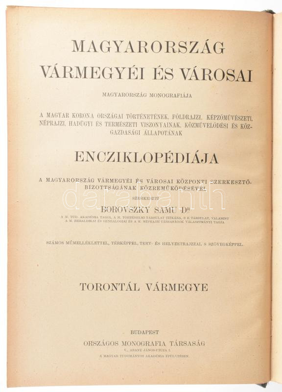 Torontál vármegye. Magyarország Vármegyéi és Városai. Szerk. Dr. Borovszky Samu. 437 képpel, ezek között 370 műnyomású autotípia, 16 szövegkép, továbbá 6 térkép és 45 czímerrrajz. Bp., [1910], Országos Monografia Társaság - Légrády. Kiadói, dombornyomott, aranyozott, festett Gottermayer egészvászon kötésben, gerinc sérült, egyébként jó állapotban , intézményi bélyegzőkkel.