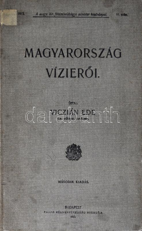 Viczián Ede: Magyarország vízierői. A m. kir. földmívelésügyi minister kiadványai 1913. 11. sz. Bp., 1913, Pallas-ny., 315+(3) p.+ 4 melléklet. Második kiadás. Kiadói egészvászon-kötés, kissé foltos borítóval, intézményi bélyegzőkkel.